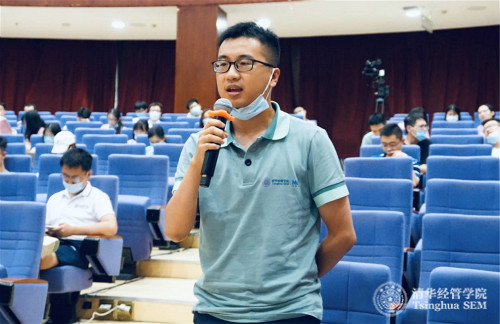 党课讲授环节结束后,陈煜波与来自各个专业和项目的研究生新同学互动交流,大家围绕中美前沿科技领域博弈、脱贫攻坚完成后期国家发展等问题踊跃发言提问,现场气氛热烈。陈煜波回答了同学们的问题并对大家积极参与、主动思考的精神予以充分肯定,引导新生同学对未来中国和世界发展趋势建立更理性的理解认知,勉励新生们坚定“四个自信”,立足本职,矢志报国,以新时代研究生之为贡献实现伟大中国梦的清华经管之力!