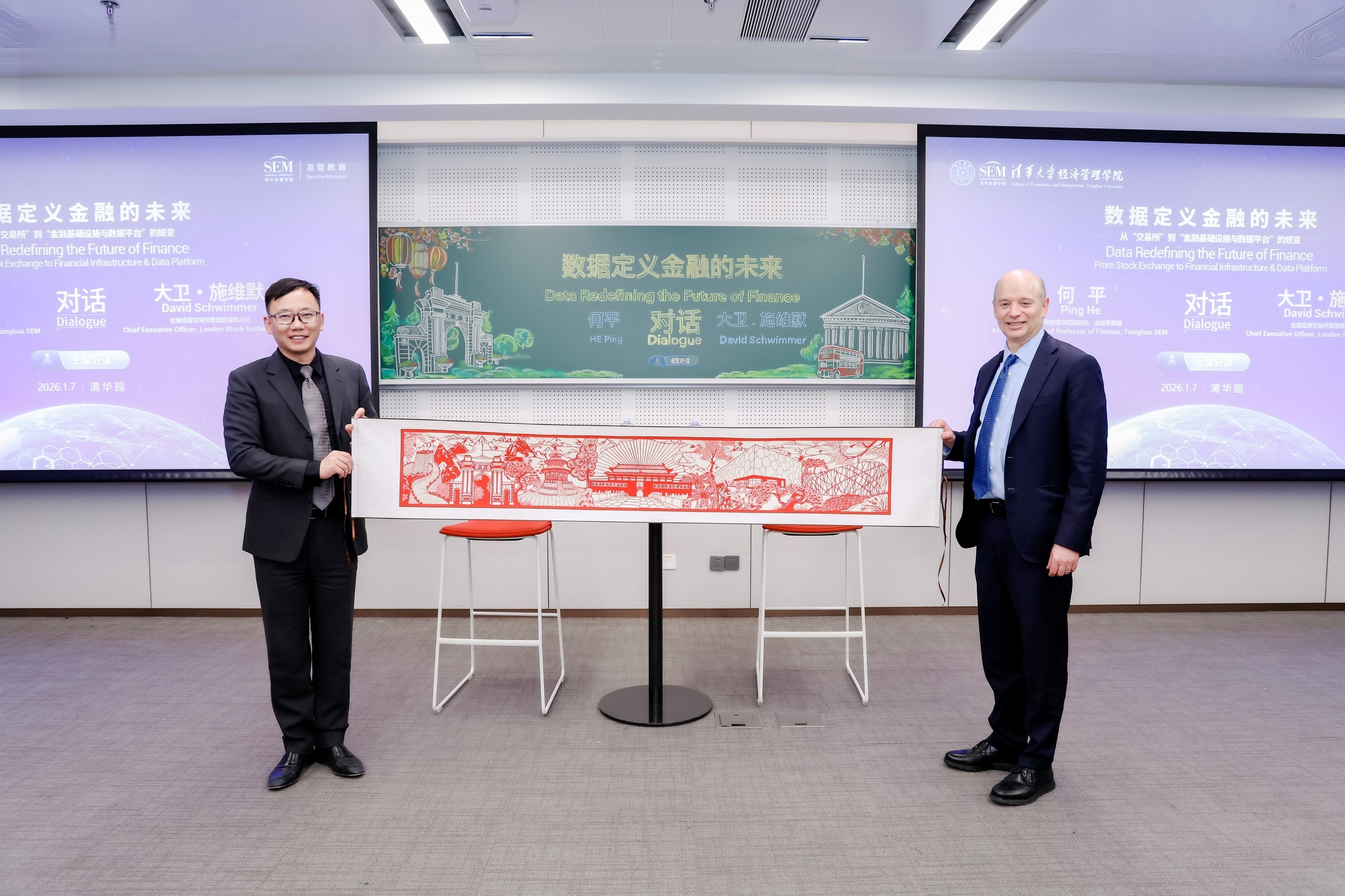 2026年1月7日,伦敦证券交易所集团(LSEG)首席执行官大卫·施维默(David Schwimmer)到访清华经管学院,与学院副院长何平展开题为“数据定义金融的未来:从‘交易所’到‘金融基础设施与数据平台’”的深度对话。本次活动由清华经管学院高管教育中心主办,伦交所集团中国区总裁陈芳(21级EMBA校友)、清华经管学院高管教育中心副主任唐云端等出席。现场汇聚众多高管教育中心各项目学员,共同探讨数字技术重塑全球金融生态的背景下全球资本市场的变革之道。
