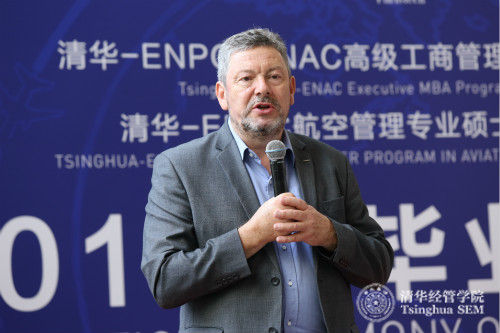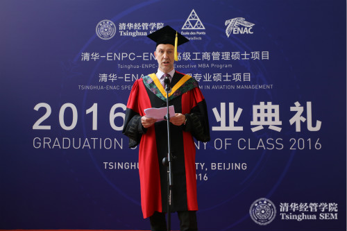 法国国立民航大学校长马克·霍拉(Marc Houalla)教授在TEE-EMBA项目及清华-ENAC航空管理专业硕士项目首期班毕业典礼上致辞