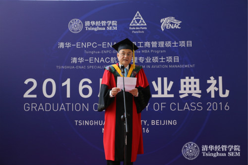钱颖一院长在致辞中首先回顾了由清华经管学院与ENPC和ENAC联合开办的EMBA项目及清华经管学院与ENAC联合开办的航空管理专业硕士项目的发展历程,这两个项目是经教育部正式批准,三校合作的专业教育课程,是中法两国文化合作项目之一。他还表示清华经管学院期待与ENPC和ENAC未来在航空领域内开展更深层次的合作,积累更丰富的教育经验。接下来,钱院长对首届TEE-EMBA项目及航空管理专业硕士项目的毕业生提出了三点希望:“第一,希望同学们作为社会的表率,带着感恩之心去回报父母、回报师长、回报社会。第二,希望同学们将来无论身在何方,无论选择了怎样的道路,都能保持执着与激情,把清华人‘自强不息,厚德载物’的精神传承和弘扬。第三,要记住你们的母校——清华大学、法国国立路桥大学、法国国立民航大学,始终都在关注着你们的每一步成长,也将始终期待着你们,期待你们的每一次成功”。