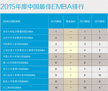 2015年12月,《经理人》杂志两年一度的“中国最佳EMBA排行榜”揭晓,清华大学经济管理学院EMBA项目再一次从国内众多优秀商学院EMBA项目中脱颖而出,连续五届蝉联排行榜榜首。