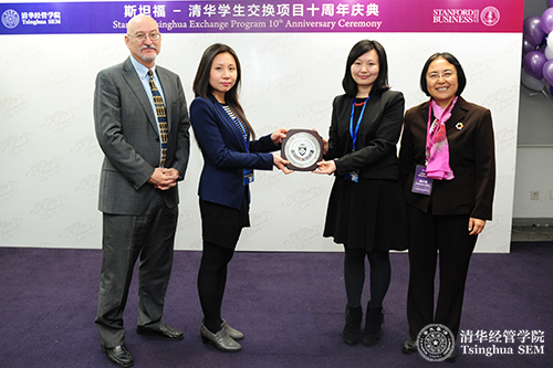 清华经管学院副院长钱小军教授(右一)向斯坦福大学商学院赠送项目十周年纪念礼品
