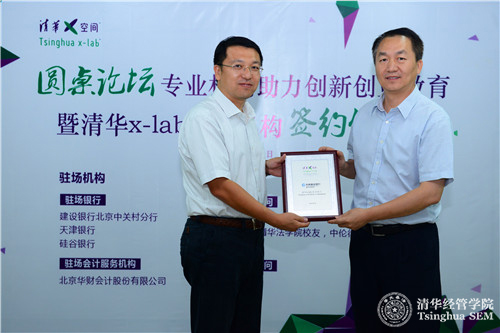 2015年9月9日,清华x-lab(清华x-空间,清华大学创意创新创业教育平台)举办“专业机构助力高校创新创业教育”圆桌论坛暨清华x-lab驻场机构签约仪式。建设银行北京中关村分行、天津银行、硅谷银行、普华永道、北京华财会计股份有限公司、北京建豪律师事务所、邱建(清华大学法学院校友,中伦律师事务所合伙人)七家机构和个人正式入驻清华x-lab场地,这是高校双创教育引入专业机构驻校服务的首次尝试。清华大学经济管理学院党委书记、创新创业与战略系高建教授,七家驻场机构代表,清华x-lab在培育项目团队代表等参加了此次活动。活动由清华x-lab执行主任毛东辉主持。