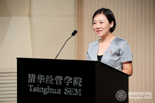 中国人保资产管理股份有限公司资深高级经理甘泉(FMBA2015级)代表新生发言。她回顾了自己的工作经历,坚信只有不断的学习,才能适合环境的变化,在现实中为今后的管理决策做出更理性的选择。她希望和各位老师、同学可以在未来两年的学习生活中进行多维度的思考与交流,融合清华大学与香港中文大学两所母校的立校精神,实现“学习新知识,收获新朋友,享受新生活”的三个突破。