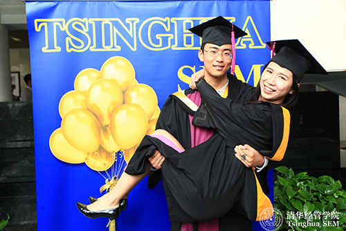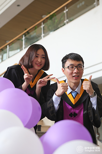 活动当天,伟伦楼、舜德楼的大厅以及两楼之间的庭院被气球彩带装饰一新。学院洋溢着节日般的喜庆气氛。中午12点开始,经管学院毕业生陆续与亲友来到现场。往日安静的庭院聚集着身着学位服的毕业生和他们的父母、家人,还有不少可爱的小朋友。每个人的脸上都幸福洋溢。在院子里,大家争相与老师、同学合影留念。今年的毕业生还领到一份富有意义的毕业戒指,清华经管学院是他们永远的家园。