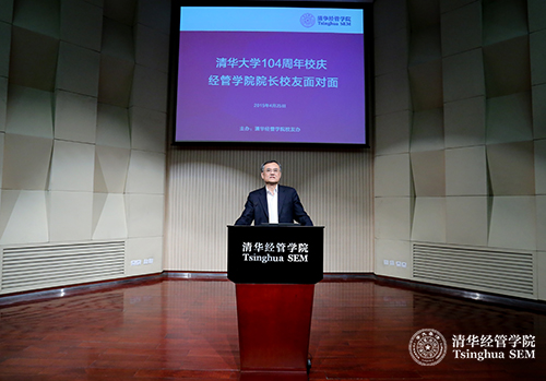 2015年4月25日下午,在清华大学104周年校庆之际,“经管学院院长校友面对面”活动在清华经管学院伟伦楼报告厅举行。清华经管学院院长钱颖一教授与校友一起共话学院发展,聆听校友心声。活动由清华经管学院党委书记、副院长高建教授主持。