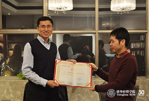 刘淳教授(右)向王子龙校友(左)颁发“清华大学经济管理学院金融硕士行业导师”聘书