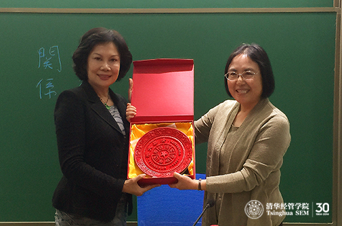 清华经管学院主管教学工作的院长助理、领导力与组织管理系钱小军教授主持了本场讲座并致开场辞。她介绍道,陈嫦芬老师曾经为经管学院MBA学生授课并担任企业家导师,当时陈老师对学生的要求非常严格,但学生们都非常感激并尊重她。当天讲座现场,许多陈嫦芬老师当年的学生特意赶来参加,现场更像是一次温馨的聚会。用陈老师自己的话来说,“这是一场缘分”。