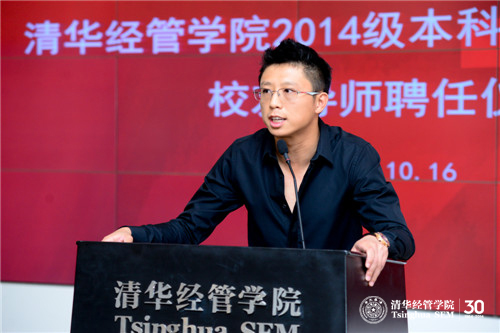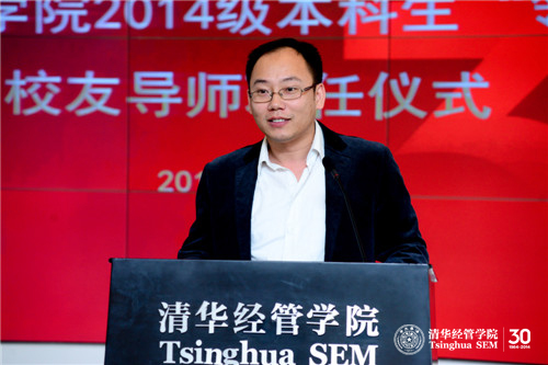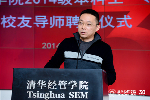 随后,导师代表肖欣(经1999)校友发言。他结合自身经历,同学们分享了自己的经验:首先要把握住刚进入清华大学时面对强手那段落寞的时光,磨砺自己,汲取宝贵经验;其次要确定自己的目标和未来的方向;再次要充分把握学校和学院提供的资源,从各方面提高实力。他还表达了自己帮助同学的决心,要努力比“六个一”的要求做得更多。