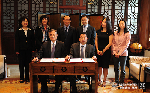 清华大学副校长兼教务长袁驷、哥伦比亚大学教务长约翰•柯兹沃斯(John Coatsworth)、清华大学经济管理学院院长钱颖一、哥伦比亚大学副教务长兼工程与应用科学学院副院长苏拉密•卡契尼(Soulaymane Kachani)、哥伦比亚大学工业工程与运筹系系主任葛路德•英贾(Garud Iyengar)共同签署了项目合作协议。