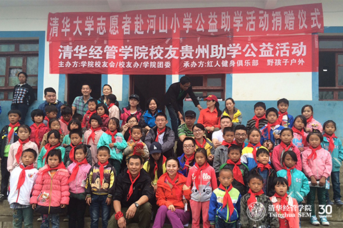 2014年9月14日,清华大学经济管理学院校友办、学院校友会及学院团委共同组织的“清华大学校友紫荆志愿者行动——贵州河山村小学公益助学活动”在贵州河山村小学开展。此次活动由清华经管学院校友办主任、学院校友会秘书长王海涛老师和校友办付双老师带队,12位清华经管学院校友和5位本科生志愿者参加。此次公益助学由“助学山区行”和“穿越红军路”两部分组成。