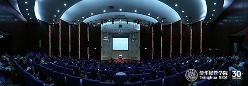 钱颖一院长首先讲述了清华校名、校徽的变迁以及百年文化传承。清华经管学院继承了清华“中西融会、古今贯通、文理渗透”的传统,以“创造知识,培育领袖,贡献中国,影响世界”为使命,并在今年提出了学院的核心价值:对己,正直诚实(Integrity);对事,敬业尽责(Dedication);对人,尊重宽容(Respect)。钱院长还与同学们分享了建院30周年活动上,朱镕基院长来信中对于学院30年发展的评价和对学院未来的期望。
