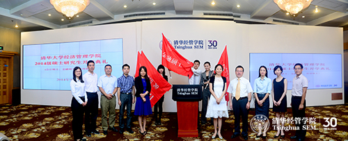 典礼的最后,各项目进行了传旗仪式,分别由罗玫教授、刘淳教授和迟巍教授将会计硕士、金融硕士和管理硕士三个项目的旗帜授予老生,再由老生传递给2014级新生,象征着清华经管学院精神的传承。