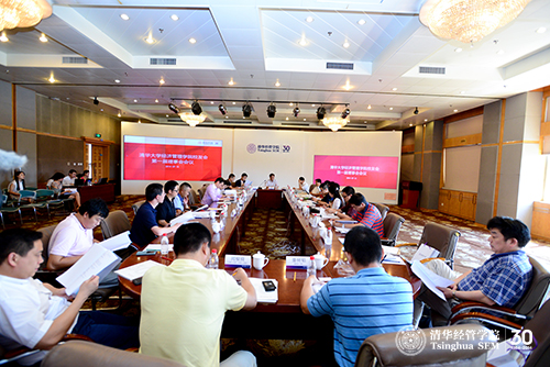 2014年7月12日下午,清华大学经济管理学院校友会第一届理事会会议在舜德楼418召开。清华经管学院院长、学院校友会会长钱颖一教授与到场的21位校友理事以及两位通过电话连线参会的校友理事一同商议、完善了校友会章程,并就如何密切学院各项目校友会与学院校友会之间的关系、增强校友会整体影响力等问题进行了深入探讨。会议由学院校友会秘书长、学院校友办公室主任王海涛(MBA2012-金融)主持。