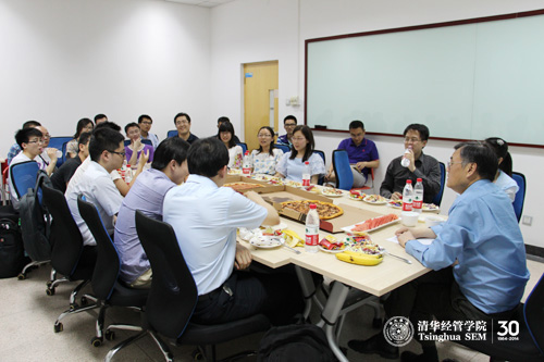 2014年5月29日,清华经管学院“院长下午茶”博士生专场活动在舜德楼223讨论室举行。经管学院院长钱颖一教授与20多位来自不同年级和专业的博士生进行了面对面的交流。在长达三个小时的交流中,钱颖一院长就博士生的学习、生活和就业等各个方面的问题与同学们进行了深入的探讨。