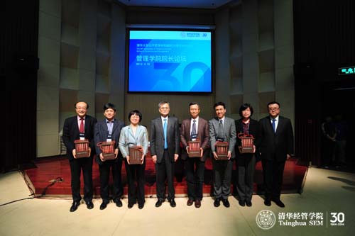 钱颖一教授在赠书仪式上说,在清华大学经济管理学院建院30周年之际,借此次管理学院院长论坛之机,向举办MBA和EMBA的全国236所MBA培养院校赠送朱镕基院长的著作《朱镕基讲话实录》。他表示,自己十分系统地读过这套书,深感受益匪浅。这其中体现了朱镕基院长治国治市的智慧、经世济民的智慧,对外交往、国际关系的智慧,同时,更有极为深刻的办学智慧。在这套《朱镕基讲话实录》中,有五篇文章是直接针对清华大学和清华经管学院的,显示朱院长的办学智慧非常高明。第一篇,1992年清华电机系建系60周年,朱院长作为电机系的毕业生为此写了一封信,其中提到“为人先于为学”的思想。第二篇,1994年经管学院建院十周年的题词,留在伟伦楼的墙壁上,提出“办世界第一流的经管学院”。第三篇是祝贺1995年陈岱孙先生95诞辰的一封信,陈岱孙曾长期担任清华经济学系的系主任。第四篇是在2001年顾问委员会会议上,提出“教师是根本推动力”。第五篇,在2001年6月朱院长辞去清华大学经济管理学院院长时,在清华大学的那次演讲中,他殷切希望清华人要“追求完美”。
