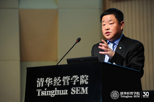 清华经管学院院长助理陈劲教授作为主持人首先邀请中粮集团有限公司董事长宁高宁做主题演讲。宁高宁先生以“改革”为主题,从中国的历史、政治、经济、文化等各个方面深度解读了国企改革的过去、现状及未来发展道路。清华经管学院宁向东教授与宁高宁先生在对谈环节中,就国有资产管理体制改革最紧要的工作,混合所有制是否有助于解决国有企业以及中国的食品安全等当下经济中的热点及难点问题展开深入探讨。