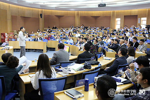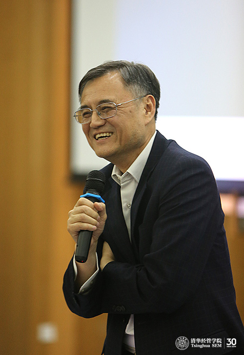 接受赠书的EMBA14-A、B、C班同学正在上《中国经济与金融》课程,而这门课程正是由钱颖一院长讲授。在完成一整天的辛苦授课之后,钱院长参加了此次活动,并为赠书仪式作了总结性致辞。钱颖一院长首先肯定了这次活动的重要意义,他指出需要传承的是朱院长的智慧和思想。钱院长解释说,在朱院长的智慧中有治国治市的智慧,有经世济民的智慧,也包括了很多对外交往、国际关系的智慧,以及对大学和学院的办学智慧。钱院长着重说明了办学智慧,在四本《朱镕基讲话实录》中,有五篇文章是直接针对清华大学和清华经管学院的,老院长的办学智慧非常高明。1992年,是清华电机系建系60周年,老院长作为电机系的毕业生为此写了一封信,其中提到“为人先于为学”的思想。1994年,经管学院建院十周年的题词,就留在伟伦楼的墙壁上,提出“办世界第一流的经管学院”。1995年,有一封祝贺陈岱孙先生九十五华诞的信。在2001年顾问委员会会议上,提出“教师是根本推动力”。在2001年6月清华大学的演讲中,朱院长殷切希望清华人要“追求完美”。朱院长的办学智慧,在他的书中有诸多体现,且意味深长。一定要将朱院长的智慧和经管的精神代代相传,有了这样的积淀,清华经管人就会对未来的三十年、六十年、乃至更长时间充满信心。