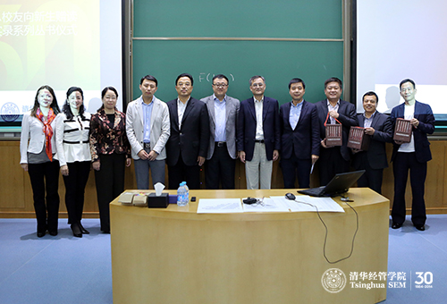 2014年4月17日下午,距清华经管学院30周年院庆日还有9天,一场简单而隆重的赠书仪式在舜德楼401教室举行。清华EMBA12级A班的校友怀着对朱镕基老院长深厚的感情和崇高的敬意,向新入学的14级A、B、C三个班同学赠送老院长的《答记者问》、《讲话实录》和《上海讲话实录》共600册,藉此献礼经管学院三十风采。清华大学经济管理学院院长钱颖一教授、清华大学研究生院常务副院长、经管学院党委书记杨斌教授、清华大学经济管理学院EMBA教育中心主任王勇博士出席了仪式。清华经管学院EMBA教育中心老师、清华EMBA12-A班校友代表及14-A、B、C班全体同学200余人参加了赠书仪式。赠书仪式由王勇主持。