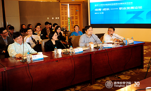 2014年3月29日,清华大学经济管理学院建院30周年系列活动“培育•成长”——职业发展论坛在舜德楼会议厅举行。本场论坛由清华经管学院职业发展中心主办,院长助理、会计系王琨教授主持。清华大学就业指导中心主任张其光教授出席并致辞,清华经管学院副院长郦金梁教授、院长助理钱小军教授出席此次论坛。嘉宾包括来自摩根士丹利、联想控股、中冶海外、君联资本、强生中国、麦肯锡、GE航空、中国银行的人力资源高层管理人员。近百名知名企业雇主、校友及在校学生参加了本次论坛。