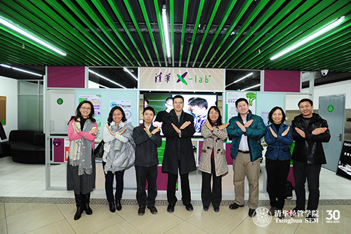 中关村管委会副主任马胜杰一行在清华x-lab场地形象区留影