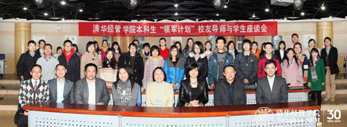 2013年11月28日,清华经管学院本科生“领军计划”校友导师与学生座谈会在舜德楼102举行。六位校友导师回到母校,与2012、2013级本科同学们一起,畅谈自己的大学时光,分享对人生的感悟。清华经管学院党委副书记、创新创业与战略系焦捷教授,院长助理、领导力与组织管理系钱小军教授,教学办公室副主任周光老师出席了本次活动。活动由学院学生工作组组长、金融系何平教授主持。