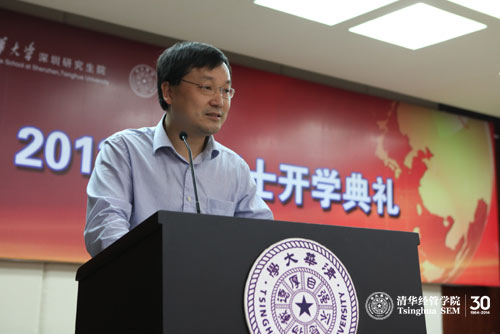 深圳研究生院院长康飞宇教授首先致辞,他简单介绍了深圳研究生院的办学历程和学科建设情况。康院长说,经管学院的金融硕士深圳班是经管学院和深圳研究生院共同打造的项目,配备了一流的师资和教学设施。他鼓励学生今后多尝试创业项目,做一个堂堂正正的清华人,并祝愿新同学学业有成。