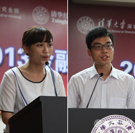 在学生代表发言的环节中,老生代表2012级梁戍同学说,“深圳的创业家精神,热情的任课老师,丰富的教育资源,都对我产生了深刻的影响。”梁戍告诉大家,通过课程案例分析的小组讨论等集体活动,使她在收获知识的同时,也与同学们结下了深厚的友谊。“不做清华资源的消耗者,要做清华资源的创造者和清华力量的贡献者。”梁戍说。2013级新生代表洪高浩则就“坚持,珍惜,责任”几点展开发言,呼吁同学们要像老一代清华人那样,将自身发展与民族崛起紧密联系在一起。