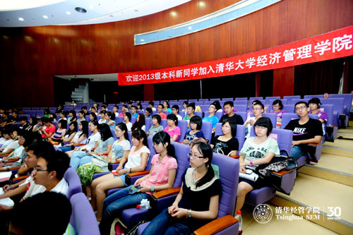 2013年8月23日,清华大学经济管理学院2013级本科生入学导向活动在伟伦楼报告厅举行。院长钱颖一教授、党委副书记焦捷教授、教学办主任朱玉杰教授、学生工作组组长何平教授以及本科项目学术协调人、班主任、学院相关职能部门老师、学生辅导员同全体本科新生以及转系生一起参加了入学导向活动。朱玉杰教授主持了本次活动。