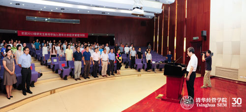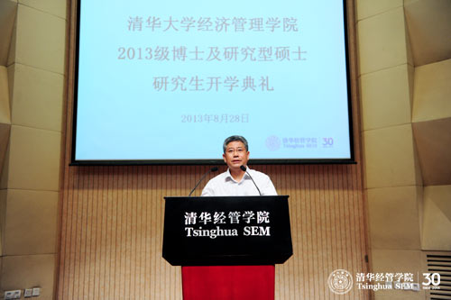 2013年8月28日,清华大学经济管理学院2013级研究生开学典礼在伟伦楼报告厅举行。弗里曼经济学讲席教授(Mansfield Freeman Chair Professor)、副院长、经济系系主任白重恩教授、党委副书记焦捷教授、教学办公室主任朱玉杰教授、研究生工作组组长杨思群教授以及硕士项目学术协调人和博士项目学术协调人等多位教师与百余位研究生新生一起参加了典礼。典礼由朱玉杰教授主持,白重恩教授为新生致辞。