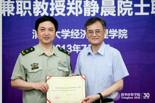 2013年7月9日下午,清华经管学院举行授聘仪式,正式聘任清华EMBA校友、武警后勤部副部长、武警总医院院长郑静晨院士为清华大学兼职教授。经管学院院长钱颖一、党委书记杨斌、党委副书记朱岩等出席了仪式,活动由杨斌教授主持。