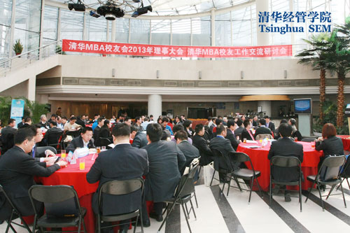 2013年3月23日上午,清华MBA校友会在清华大学主楼接待厅召开2013年理事大会。会议通过中期增选理事27名,常务理事17名,副理事长8名,审议通过了校友会2012年工作报告和2013年工作计划并颁发了集体贡献奖和特殊贡献奖。清华经管学院副院长郦金梁教授出席了上午的会议并致辞,清华MBA校友会常务副理事长龙大伟(MBA1993)在大会上做出专题报告,副理事长兼秘书长姜培兴(MBA1995)主持会议。来自香港、深圳、上海、成都、北京等16个地市的64名MBA校友理事以及校友嘉宾、MBA师生共84名出席了本次理事大会。