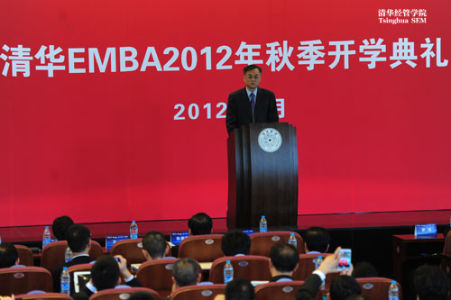9月19日下午,清华EMBA2012年秋季开学典礼在清华大学主楼后厅举行。典礼首次由清华经管学院与清华五道口金融学院共同举办,来自2012级清华经管学院EMBA、第八期清华—花旗EMBA媒体班、以及首届五道口金融EMBA的400多位同学参加了开学典礼。清华大学经济管理学院院长钱颖一、院长助理狄瑞鹏,清华大学五道口金融学院常务副院长廖理、党委副书记赵岑等参加了典礼。