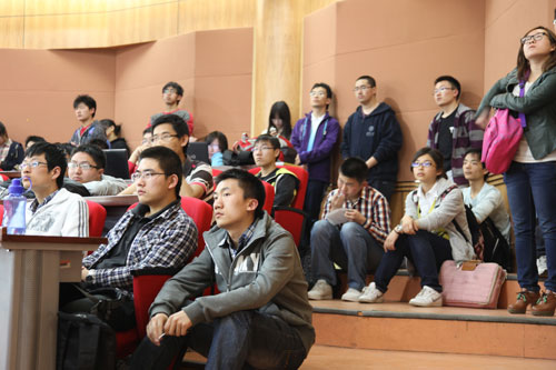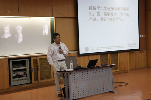 4月26日,在清华大学经济管理学院舜德401的经济学第二学位招生说明会现场,经管学院副院长、经济系系主任白重恩教授,经济系副系主任、本科学术协调人钟笑寒教授为有意报考经济学第二学位的200余名清华学生简要说明了上述问题,同时详细讲解了经济学第二学位的由来、培养目的、师资配备、课程设置、毕业生去向以及学习经济学第二学位的意义等问题。经济学第二学位项目学术协调人杨思群教授主持了本次招生说明会。校团委宣传部副部长、经管学院市场营销系博士生、2006级经济学第二学位学生贾思雪,以及生物系科协主席、2009级经济学第二学位学生欧阳书淼结合自身经历与同学们分享了经济学二学位的学习心得。招生说明会结束前,同学们就二学位申报资料、录取标准、课程替代等问题与参加招生说明会的老师进行了交流。