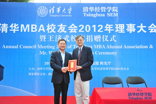 3月20日下午,2012年清华MBA校友理事大会暨王济武校友捐赠仪式在清华科技园阳光厅举行,清华经管学院1997级MBA校友、MBA校友会副理事长、香港百骏(中国)投资控股有限公司董事长王济武捐资100万元,带头为恢复运行的清华MBA校友会“输血”。
