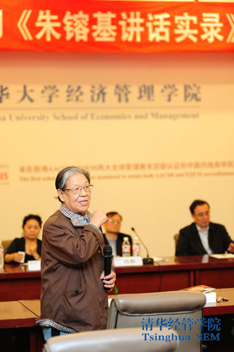 清华经管学院合作发展办公室主任潘庆中回忆起他在1980年刚入清华大学时,在大礼堂听朱鎔基作经济形势报告的情形,感慨多年来朱院长对学院的支持和对学院发展倾注的心血。他还建议:“人民出版社是否可以考虑出版一本名为‘朱镕基与清华经管学院’的书,因为大家有太多要讲述的故事。”