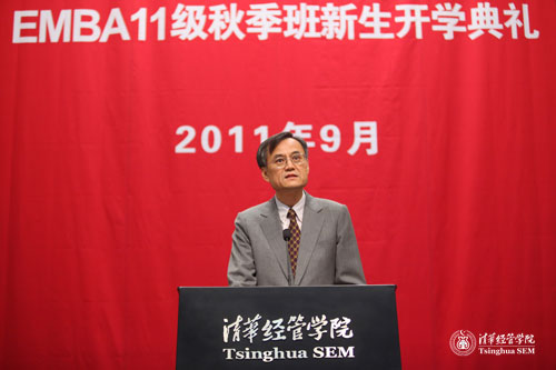 下午三点,清华EMBA2011秋季班开学典礼在伟伦楼国际报告厅隆重举行。清华大学经济管理学院院长钱颖一教授出席典礼并致辞。清华大学经济管理学院副院长、EMBA教育中心主任廖理教授主持开学典礼。