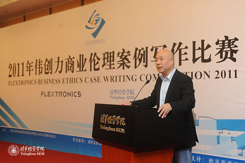在启动仪式上,伟创力公司全球企业社会责任及员工关系副总裁Richard Wong先生,回顾了自2010年8月双方签署合作协议以来成功举办的一系列活动:伟创力教室揭幕、企业社会责任讲堂、商业伦理辩论大赛等,而清华经管学院顾问委员会委员,伟创力集团首席执行官Michael McNamara先生曾多次提到企业社会责任的重要性。Richard Wong先生在开幕辞中表达了公司高层对此次比赛的期待:虽然培养商业伦理理念不能一蹴而就,但通过我们的点滴努力,将推动社会更加和谐,更加强大。当谈及大赛意义时,Richard Wong先生表示:案例教学是对教科书学习的有益补充。伟创力选择赞助此次大赛,体现了作为一家有社会责任感的跨国公司,在推动负责任、讲道德的商业实践中所作的努力。
