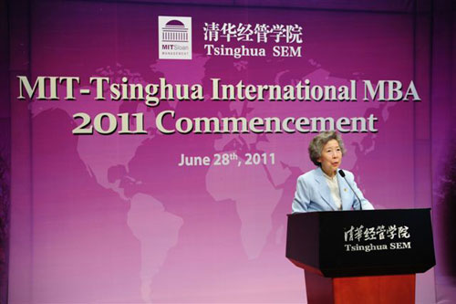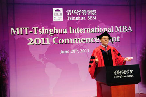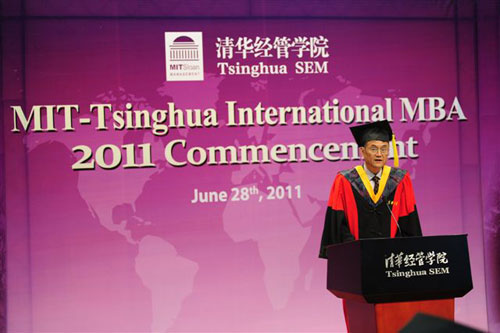 清华经管学院院长钱颖一教授首先致辞,他介绍说,今年毕业的101名国际MBA学生中,有50名来自海外及中国香港、台湾地区。2011届清华国际MBA学生毕业之年恰逢清华大学百年校庆,清华经管学院MBA项目成立20周年,清华MBA项目与麻省理工学院(MIT)斯隆管理学院合作15周年。本届毕业生是新版清华MBA课程改革实施后的第一届学生,有机会学习到许多新增的提升软技能和管理实践能力的MBA课程。钱院长感谢同学们的支持和积极参与,祝贺大家从清华MBA学生成为清华MBA校友。