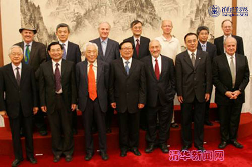 全国人大常委会副委员长华建敏(前排中)与参会代表们及清华大学党委书记胡和平(前排左二)、副校长谢维和(前排右二)、著名经济学家吴敬琏(前排左一)、清华经管学院院长钱颖一(后排左四)、副院长白重恩(后排右二)等合影。