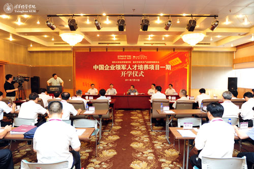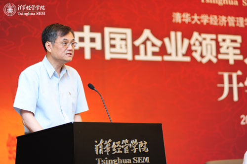 7月11日,经过长期、周全的筹备工作,由清华大学经济管理学院开创设计的“中国企业领军人才培养项目”重庆班首期的开班仪式在学院舜德楼举行。这是清华经管学院在整合清华优质教育、师资资源的基础上,与重庆市政府共同开展的企业高端人才培养项目。清华大学副校长程建平,清华经管学院院长钱颖一,清华大学教育培训管理处处长邓丽曼,清华经管学院副院长夏冬林,清华经管学院教授、项目导师组组长陈章武,与重庆市政府副秘书长、重庆市国资委主任崔坚,重庆市国资委党委副书记罗聪,以及项目领导小组和项目联络组的领导参加了开班仪式,仪式由清华经管学院高级管理培训中心主任薛镭主持。
