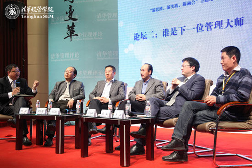 在“谁是下一位管理大师”论坛上,中国企业家俱乐部创始人、常务副理事长刘东华先生,北京大学光华管理学院战略管理系周长辉教授,TCL集团执行董事、首席运营官薄连明先生,罗兰贝格管理咨询公司合伙人、大中华区副总裁张宏先生,清华大学经济管理学院市场营销系李飞教授作为嘉宾分别发表了各自的观点。论坛由清华经管学院党委书记杨斌教授主持。