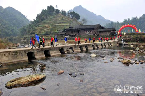 2010年11月25日,风景如画的湘西沅陵,一支着装整齐的队伍行进在乡村小道上,他们是来自清华大学EMBA09级、10级及各地同学会参加“清华一百年 重走联大路”活动的同学们。此次,他们将在湖南进行为期4天的徒步挑战赛。在这四天时间里,同学们将负重翻越湘西的崇山峻岭,最后抵达湘西抗战名城—芷江。