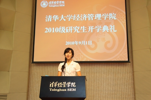 清华经管学院研究生会主席赵前同学代表在校研究生发言。他希望新同学们能志怀高远,充分发挥潜能;心怀天下,有强烈的社会责任感;拥有开放而包容的心态和不怕吃苦的精神。赵前特别提到2010级研究生同学入学第一年恰逢清华大学百年校庆的特殊意义。“你们和你们即将求学于此的清华在崭新的起点上一起上路了,”他说,“你们应该创造属于你们,也属于母校的更大辉煌。”