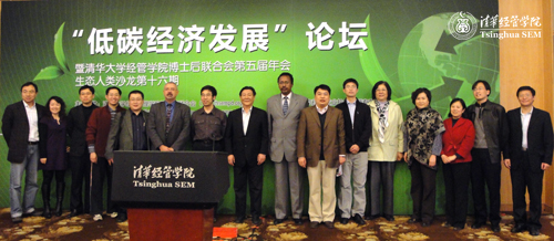 4月24日下午,为庆祝清华大学成立99周年,在清华大学博士后管理办公室及清华经管学院的大力支持下,“低碳经济发展”论坛暨清华经管学院博士后联合会第五届年会、生态人类沙龙第十六期在舜德楼多功能厅成功举办。清华经管学院党委书记杨斌教授出席论坛并致开幕词,清华经管学院党委副书记朱岩教授、人事办公室主任吴淑媛老师、校友办公室主任邢立君老师出席。论坛由清华经管学院博士后联合会理事长常良峰主持,清华经管学院在站和出站博士后以及关注低碳经济的生态人类联盟成员共90余人参加了本次活动。