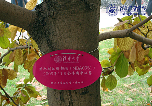 为感谢母校培养、支持绿色校园建设,清华经管学院2009铁道部MBA班(MBA09S1)全体学员出资5000元认养经管学院伟伦楼前玉兰树一棵,认养期限20年。清华大学绿色大学办公室副主任梁立军和清华经管学院党委书记杨斌分别代表大学和学院对铁道部MBA班认养校园树木表示肯定和感谢。