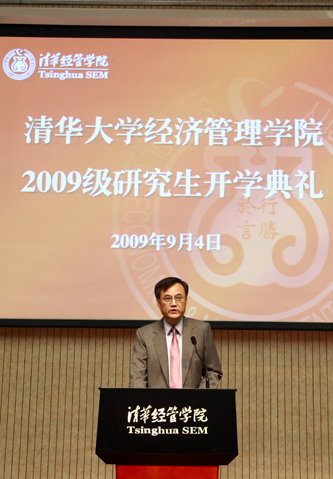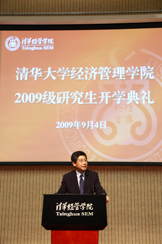 9月4日下午2时,清华大学经济管理学院2009级研究生开学典礼在伟伦楼国际报告厅隆重举行。院长钱颖一,党委书记杨斌,副院长陈国青、夏冬林,党委副书记朱岩、赵冬青,院长助理高建等领导和老师出席典礼,与2009级研究生新生共同见证了这一难忘时刻。典礼由副院长白重恩主持。