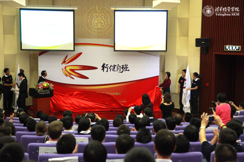 庄严的中华人民共和国国歌和悠扬的清华老校歌拉开了活动序幕,4位新生护送清华经管学院院旗和清华大学MBA同学会会旗上场。随后,学院党委副书记朱岩和MBA教育中心常务副主任毛东辉共同为“行健自强”主题墙揭幕。