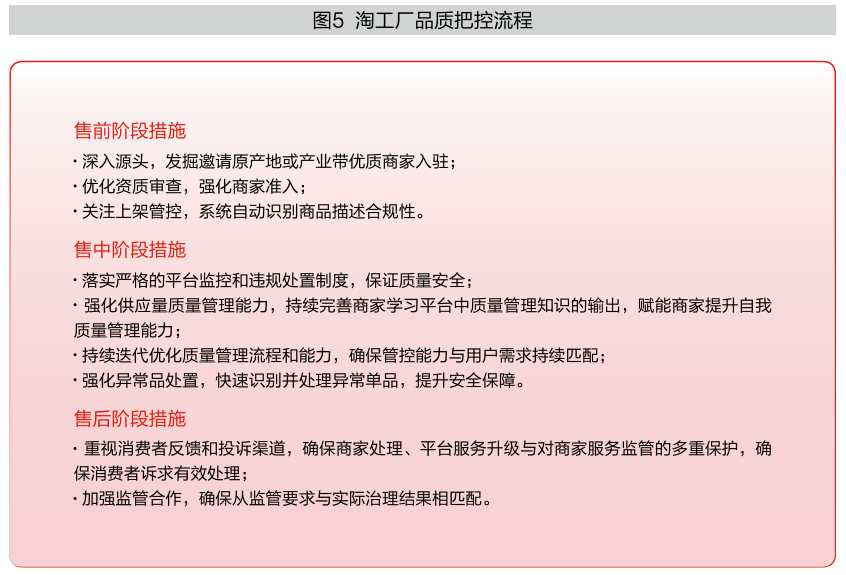 淘工厂极为重视消费者品质体验的管理,结合业务特性在质量管理方面显示出强大的决心和能力。通过9大措施,从售前、售中、售后介入供应链管理,提升商品质量(见图5)。通过细致的品质把控,一方面为消费者提供有保障的商品和服务,同时也一定程度上推动县域产业带商家重视生产品质。
