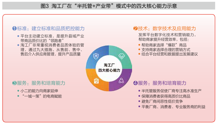 淘工厂作为该模式的核心主体,主要有四大核心能力——建立标准和品质把控能力、数字技术及应用能力、服务和培育能力以及多主体之间协同能力(见图3)。